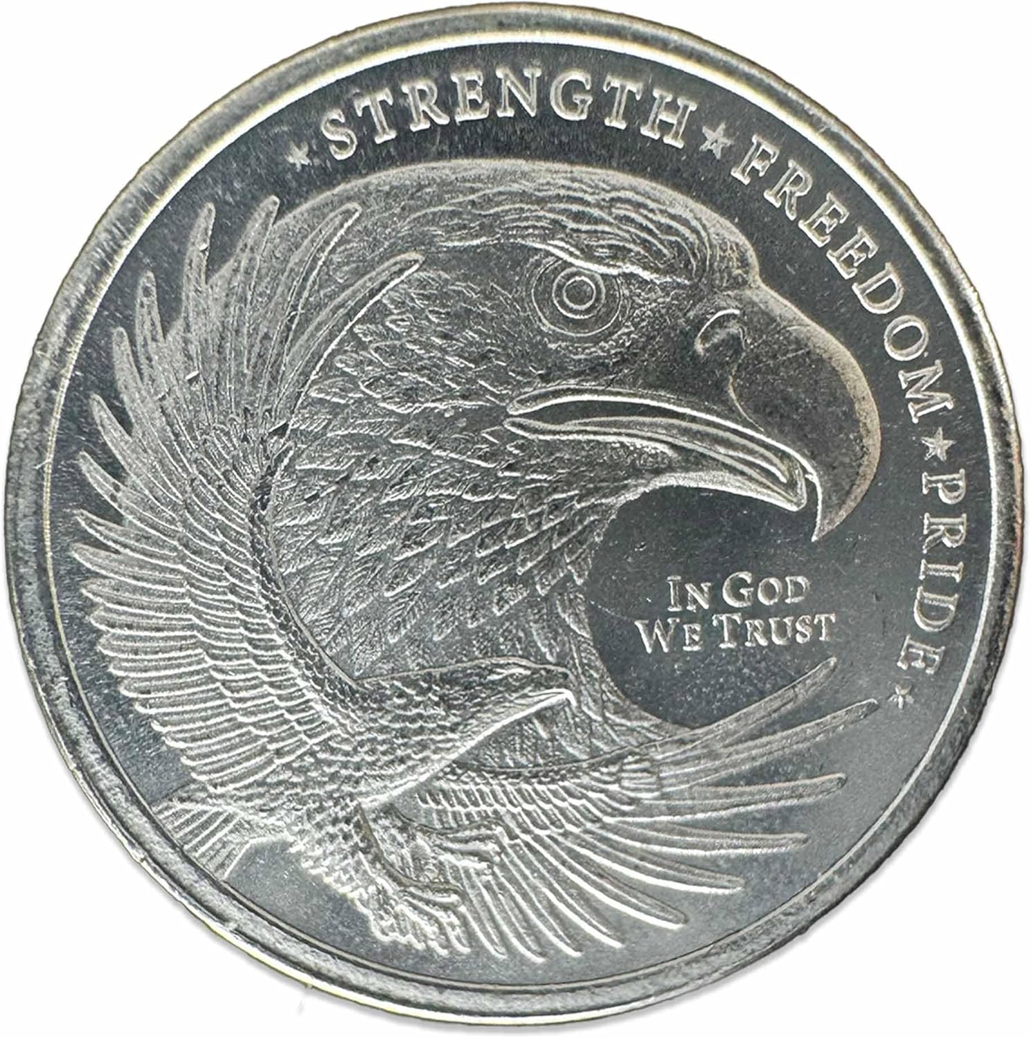 1/10 Troy Oz. Silver Double Eagle Round| Commemorative piece made from .999 Fine Silver Made in USA In tribute to our free country, this beautiful physical commemorative coin displays an eagle and the spread wings of a soaring eagle, along with an eagle head and, on its reverse, a beautifully struck waving American flag. This coin-shaped silver round is manufactured in the USA and made from real .999 fine silver 1/10 Troy Oz. It holds its value in silver and will make a beautiful addition to any collection.