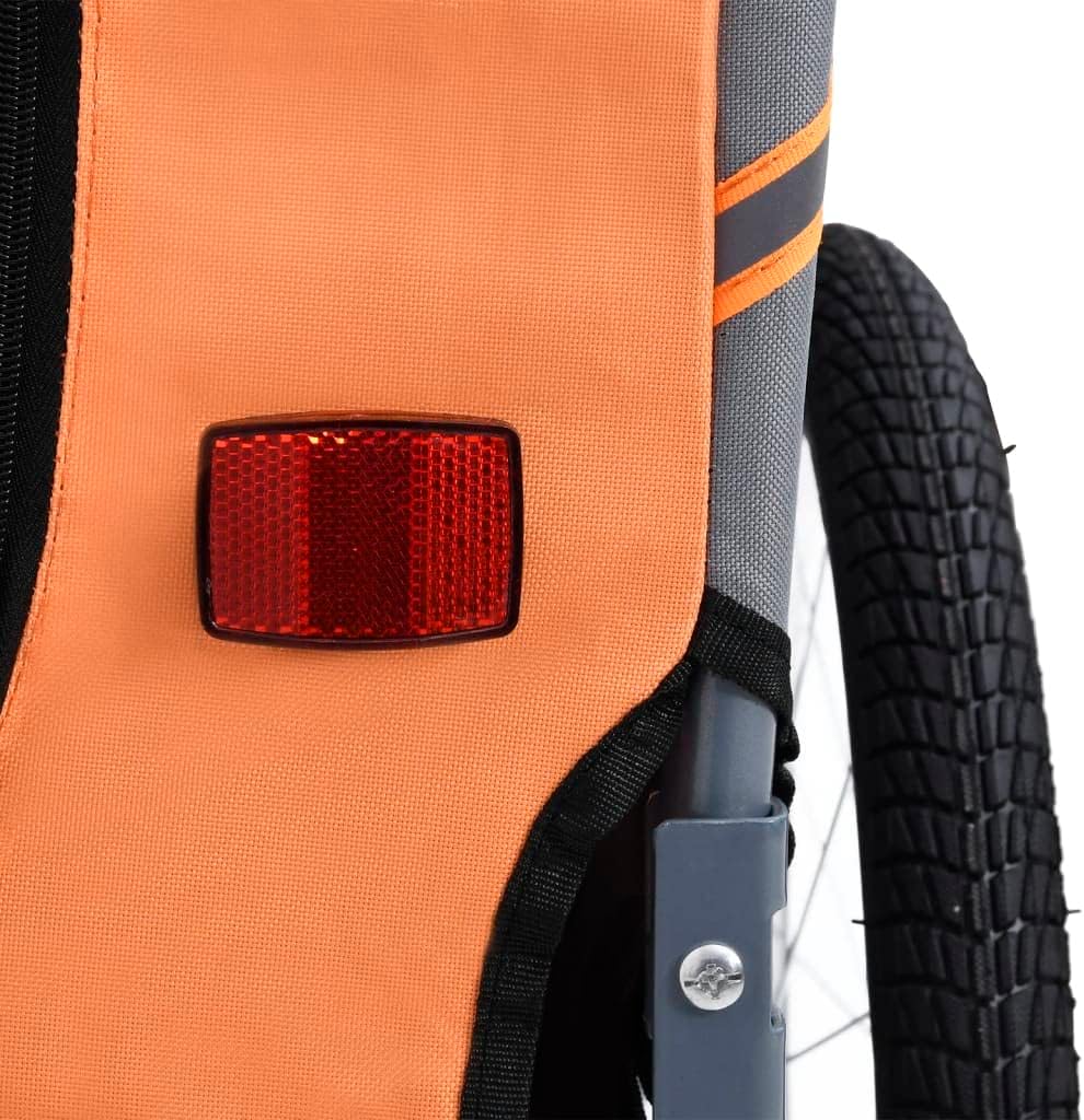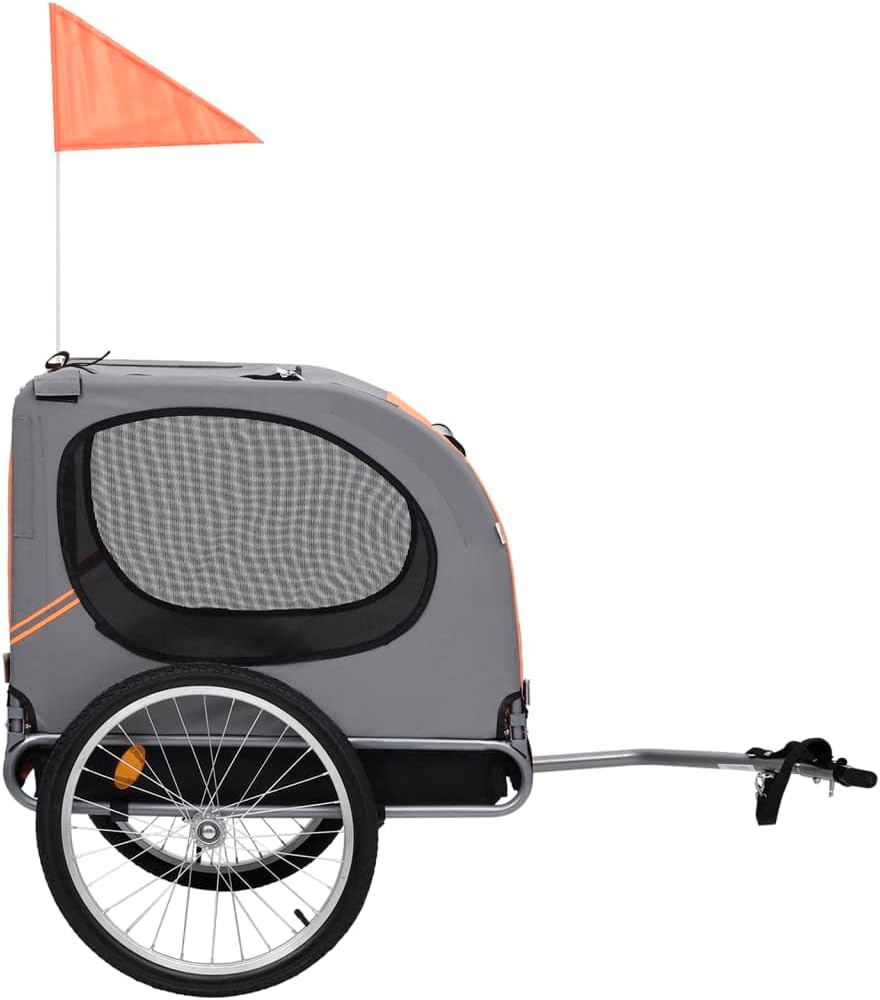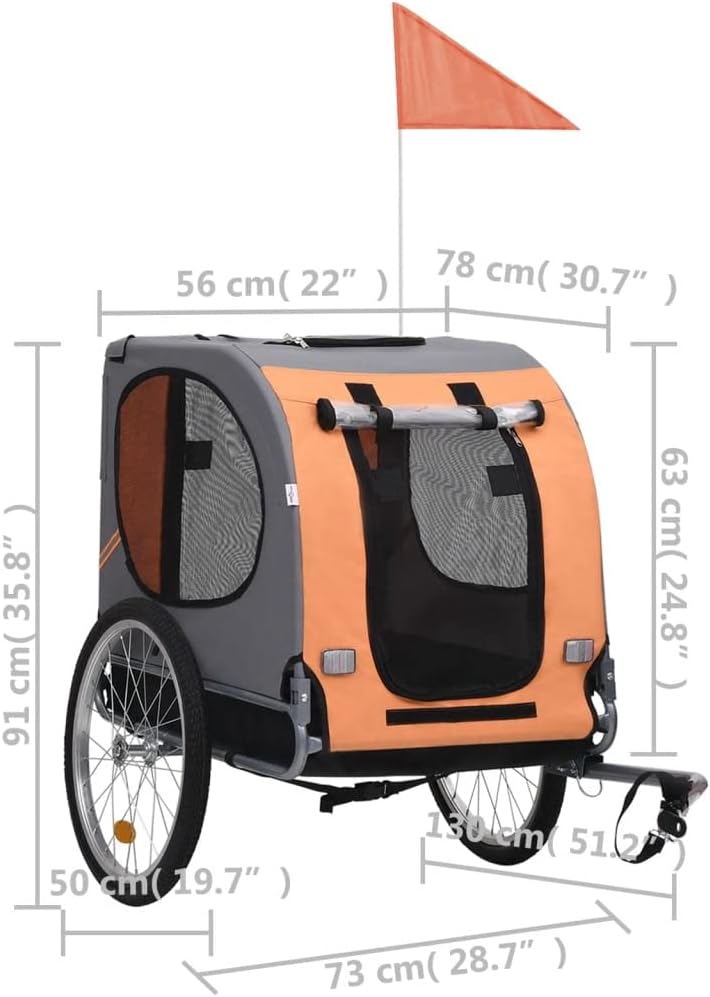 This dog bike trailer will be an ideal choice when you want to take a bike ride with your dog.This dog bike trailer has a sturdy steel frame and is made of oxford fabric that makes it water resistant, durable and easy to maintain. Its mesh windows on both sides allow for air circulation, while the front and back offer dual entry for added convenience. The pet bike trailer has a suspension for a smooth ride and a leash hook in the interior for attaching a dog leash. The reflectors on each wheel and on the back help keep you and your pet visible to others. The rotating safety joint ensures that the trailer remains standing if the bicycle falls over. The base is reinforced with a special lining which is non slip and moisture resistant. The dog bike trailer has a quick-release hitch for easy attachment to the bike. This dog trailer can be folded to save space when not in use. It is easy to assemble.Color: Orange and grayMaterial: Oxford fabric + steel frameOverall dimensions with drawbar: 51.2" x 28.7" x 35.8" (L x W x H)Cabin dimensions: 30.7" x 22" x 24.8" (L x W x H)Wheel diameter: 19.7"Weight: 23 lbWith 2 reflectors on each wheel and 2 reflectors on the backWith rain coverQuick-release wheelsA safety flag is also includedFoldable for easy storage or transportPlease note that it is not suitable for transporting childrenFabric: Polyester: 100%