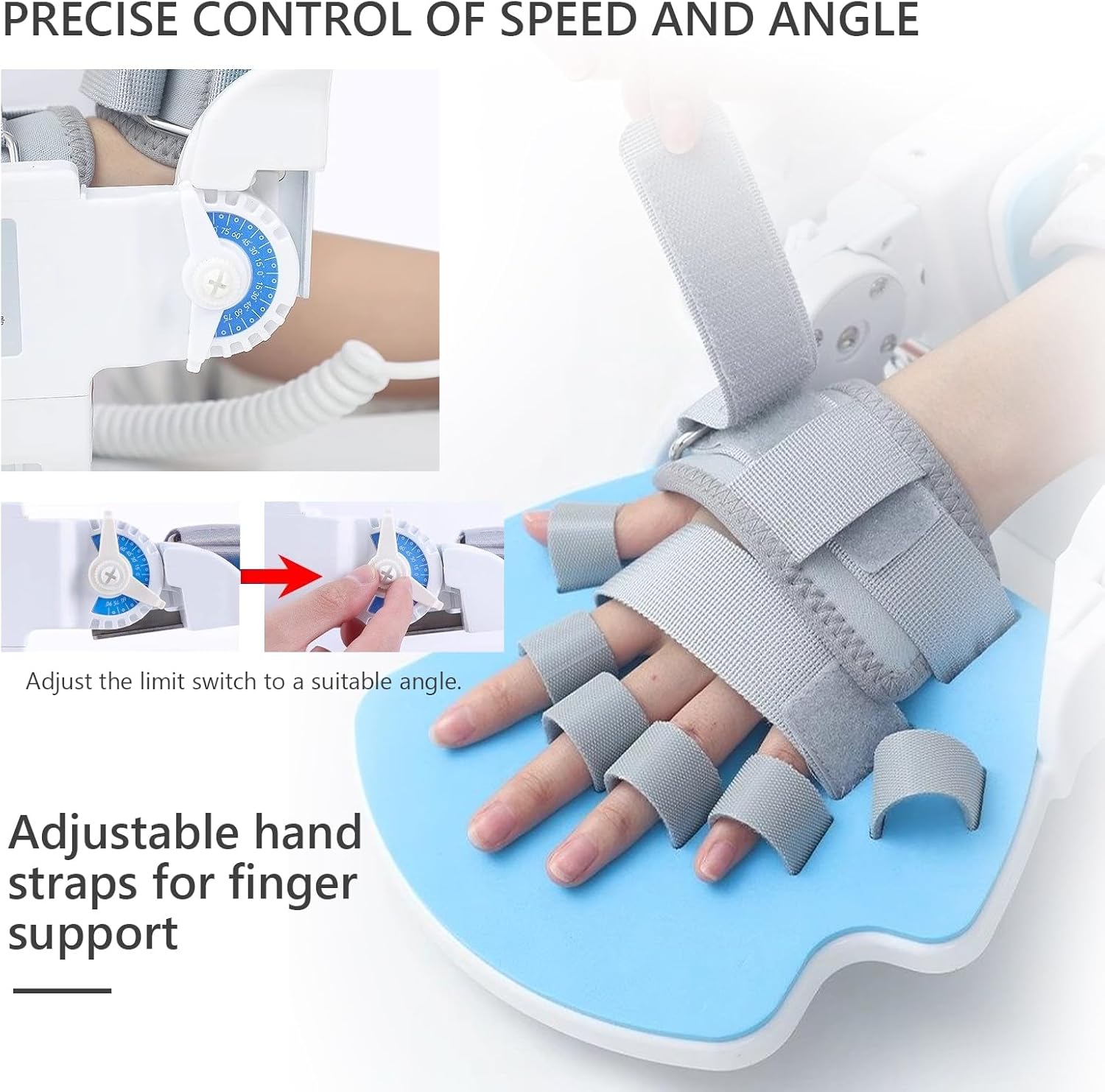 This wrist rehabilitation trainer helps you maintain stability during stretching exercises, effectively stretching the wrist joint and minimizing risk. Suitable for hand injuries such as crush injuries, tendon injuries such as tendon and/or ligament tears, fractures/dislocations/arthritis or tendinitis/carpal tunnel syndrome/post-stroke rehabilitation, etc.Exercise range: ±90° range of motionEasy to operate, no assistance requiredEquipped with remote control for simple operationName: Wrist StrengthenerPackage includes:1* Wrist StrengthenerNote:1.Before use, place the product flat on a table or platform, turn on the power, press the forward/backward button, let the product run for a period of time, and complete the self-test.2.The color of the real thing will be a little different from what is shown in the picture.3.Size for manual measurement, there will be 1~2CM error, please understand!