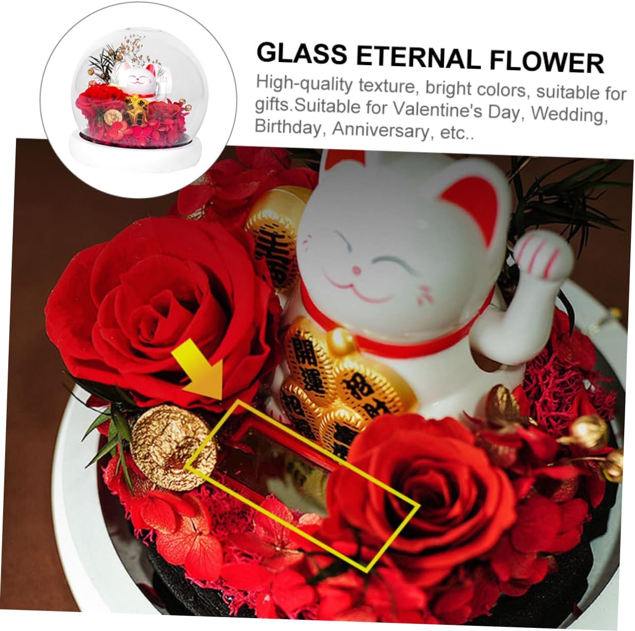 Package Include 1 x Preserved Flower Adornment Characteristics -Material: Preserved flower Glass Shape Eternal Flower - It can be used as an immortal flower glass dome adornment for your home Simulated Rose Glass Cover. - Warm yellow night light design, romantic warmth, illuminate your love Immortal Flowers Adornment. - Rechargeable solar panels, energy saving and environmental protection Immortal Flower Glass Cover. - It is great as creative and present idea to your loved one in special day Preserved Flower Adornment. - Made of and material, healthy and for use Preserved Flower Adornment.Goods InformationImmortal Flower Glass Cover We adopt -end , can keep it for a long time.Immortal Flower Glass Dome If you are looking for an eternal flower adornment with reliable and reasonable , I want to recommend this romantic eternal rose flower for you.Eternal Flower Adornment Meanwhile, it owns an attractive appearance design.Flower Glass Shade It would be your helper for you