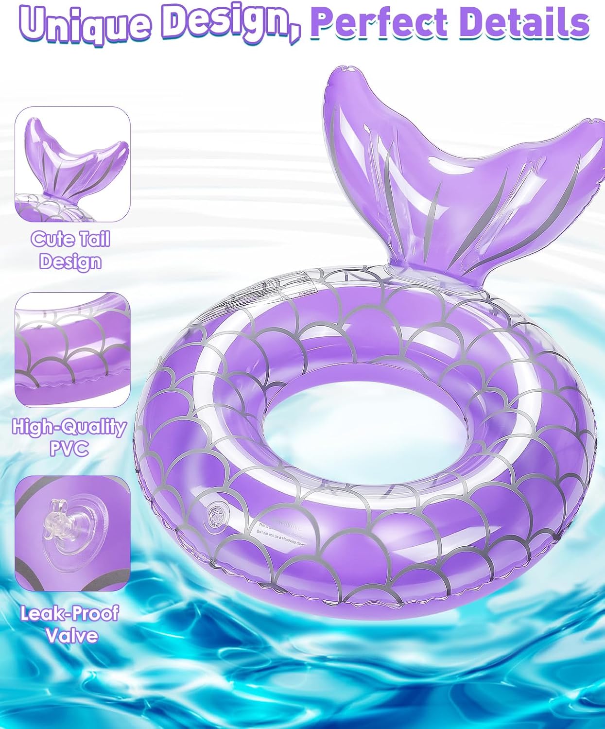 HeySplash Inflatable Swim Rings--The unique mermaid tail-shaped swim ring with special color is full of fun, it is your ideal choice for leisure and entertainment.--Made of high-quality PVC material, durable and safe. It is ergonomically designed to provide sufficient support and comfort. The ring floatie can bear a weight of 38-88 pounds.--The air nozzle is designed with internal and external double leak-proof design, making this swimming ring not easily leaky. The valve can be fully opened to deflate within a few seconds.-- You can take it to the beach, swimming pool, or party, and share the happiness with others. Suitable for oceans, lakes, rivers, swimming pools, and party decorations. Enjoy your water fun beach party. Package Contents:2 x Swim Rings