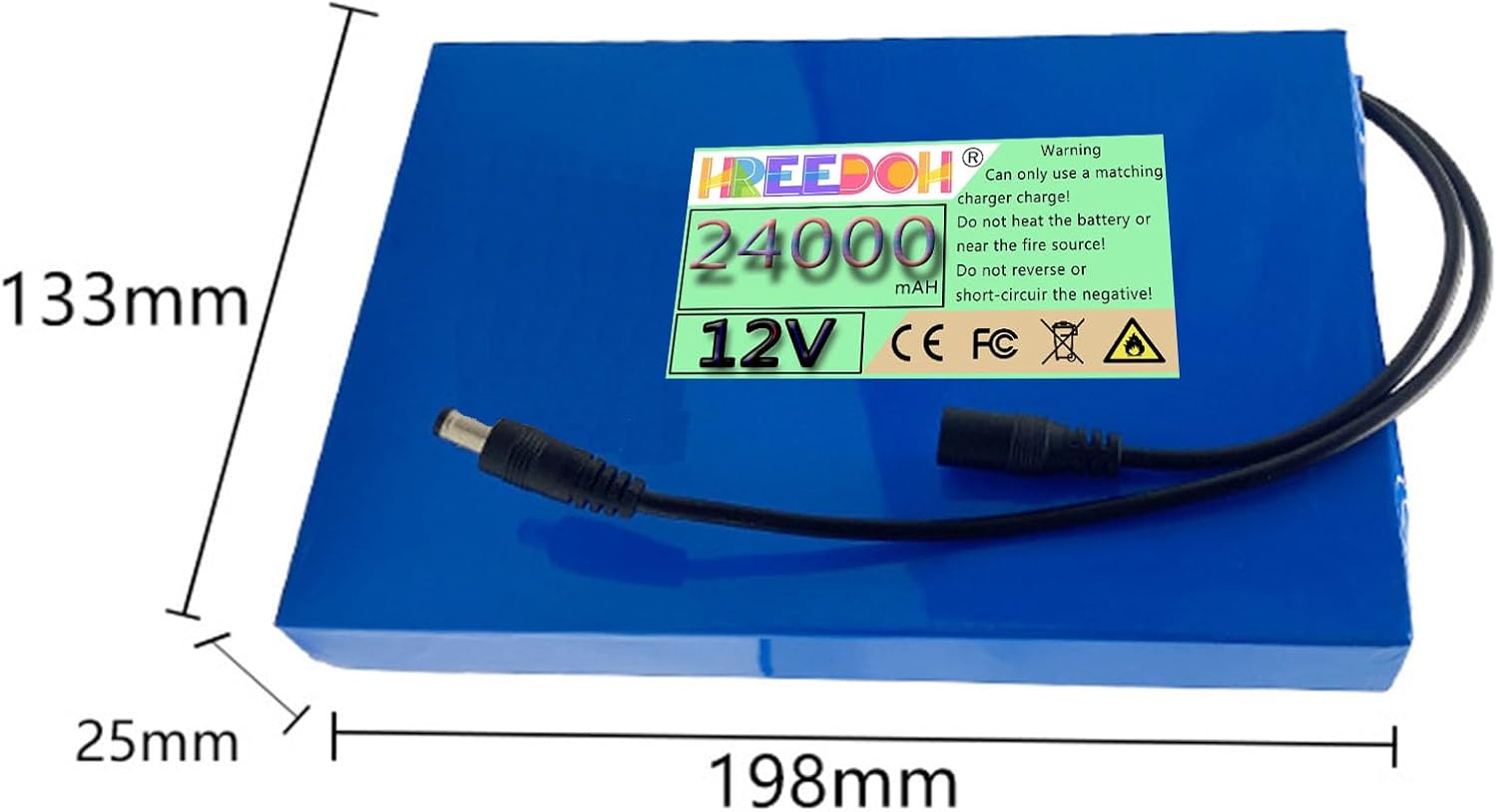 The battery is equipped with BMS protection board to protect the battery from overcharge, over discharge, overcurrent, overvoltage and short circuit.The blue PVC case, light weight, easy to transport and carry.Small size, light weight, easy to carry, sufficient power, long service life.Voltage: 12V Capacity: 16000mAh 20000mAh 24000mAh 30000mAhCharging voltage: 12.6VCharging current: 5ADischarge current: 5AOperating temperature: -20°C-60°CService life: about 1000 timesConnector: DC5.5*2.1Size and weight: 12V16000mAh: 198*133*18mm, 0.86kg12V20000mAh: 198*124*25mm, 1.2kg12V24000mAh: 198*133*25mm, 1.2kg12V30000mAh: 183*123*40mm, 1.7kgPackage Includes:12V Polymer Lithium Battery x 1Charger x 1