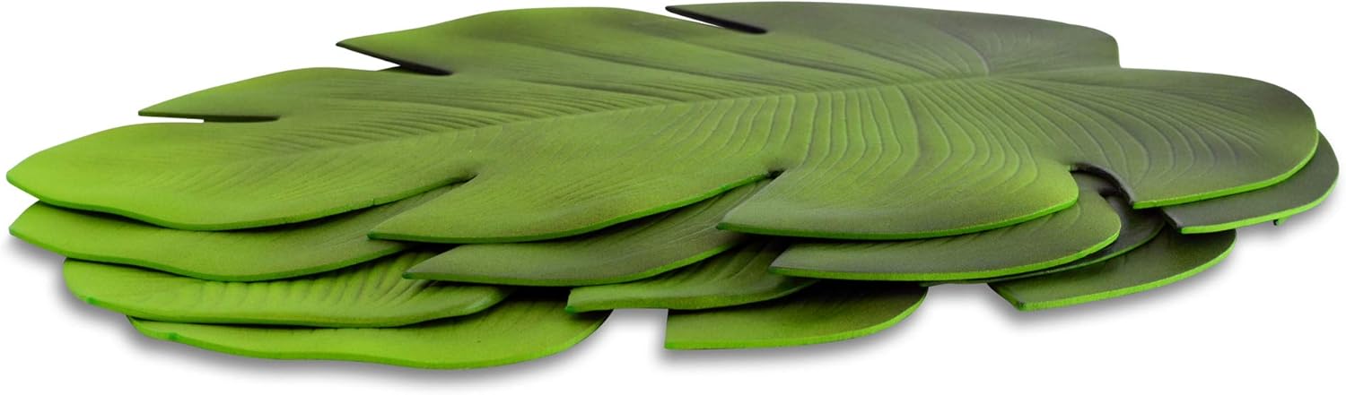Add a touch of the tropics to your table with the Tiki Palm Leaf Place Mats, Set of 4. With rounded edges with that features realistic plant grooves and texture, each mat is designed to lay flat while acting as a foundation layer to showcase your dinner plates, napkins and accessories. Well sized, each piece in the set measures as follows: 19 L x 15 H inches. Each leaf is approximately 1/8 inch thick. Easy to clean, just wipe clean with a damp cloth. High Quality Faux Plant Leaves. Sold as a set of 4, these decorative leaves, also known as Monstera, are made using the finest plastic materials and the most advanced manufacturing techniques to ensure botanical accuracy. Whisper the magic of an exotic island getaway to your guests and make your dining events extra special with the Tiki Palm Leaf Place Mats, Set of 4. So welcoming, use them for everyday use at home. Convenient to stow away, just stack and store in a drawer when not in use. Enjoy! By Whole House Worlds Welcome to the product line of Whole House Worlds. The New York based company offers high quality, stylish products for every room in the house, and beyond. From the kitchen, to the living room, to the bedroom, dining room, home office, closet and garden: Our criteria are comfort, quality, style and value.