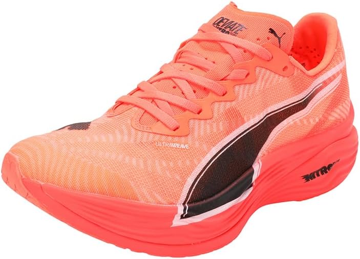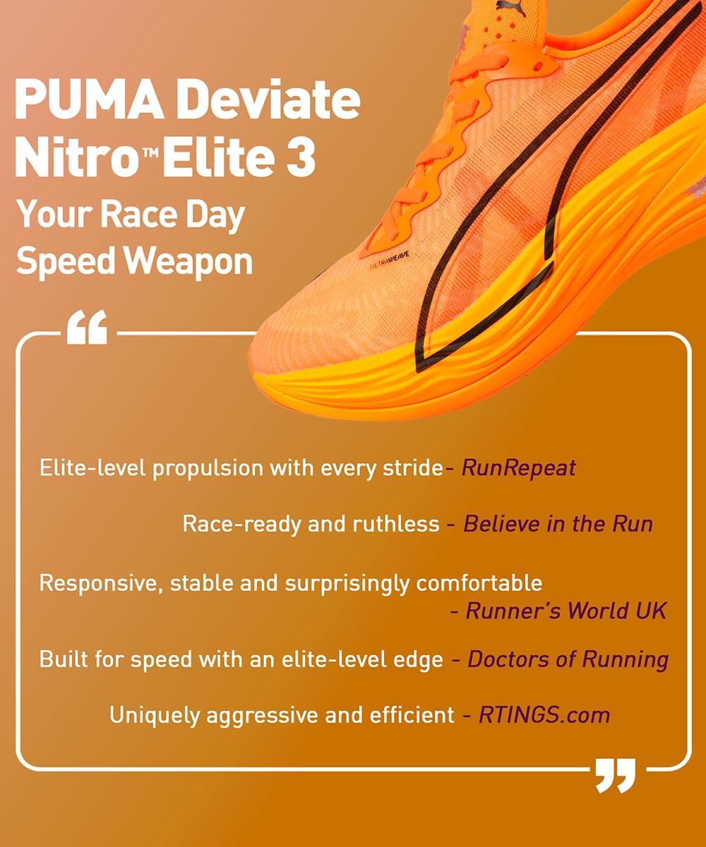 PRODUCT STORY : Hit turbo speed. The Deviate NITRO™ Elite 3 is a running shoe redesigned for lightweight, race day propulsion. A carbon fibre PWRPLATE ensures stability and maximum running efficiency, while NITROFOAM™ ELITE offers supreme cushioning that won't weigh you down. It's a running go-to made with lightweight mono-mesh and durable PUMAGRIP rubber for multi-surface traction and an effortless run. FEATURES & BENEFITS : NITROFOAM™ ELITE: Premium performance foam technology that provides pinnacle responsiveness in an extremely lightweight package, PWRPLATE: Carbon fibre plate engineered to stabilise the midsole while maximising energy transfer, ULTRAWEAVE: Ultra-light, engineered fabric with a structured, 4-way stretch that reduces weight and friction. Built for athletes looking to increase speed and strength. DETAILS : Regular fit, ULTRAWEAVE upper, Stack height: 40mm/32mm, Weight: 194g (size UK8), Heel-to-toe drop: 8mm, Recommended for: neutral pronators.