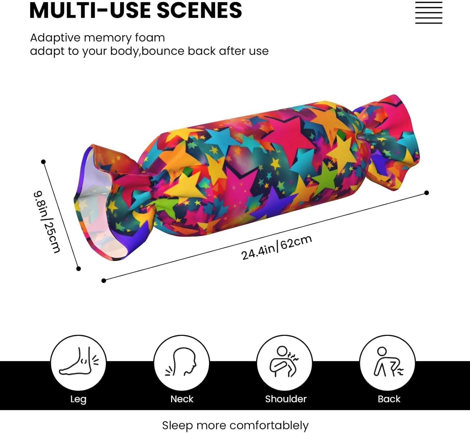 Elevate your home dÃcor with the Candy Cylindrical Pillow, a versatile and stylish bolster pillow designed for comfort and aesthetic appeal. Measuring 24.4" x 9.8" (62cm x 25cm), this round pillow is for use on the couch, in the bedroom, during yoga, or as travel support.Featuring a vibrant full-print design and crafted from velvet polyester, this pillow is both soft and .\r\n The eco-friendly, high-elastic filling ensures lasting comfort and support, while the drawstring closure allows for easy removal and cleaning.\r\nWhether you are looking for a candy-shaped novelty pillow, a decoration accent for your sofa, or a meaningful gift for birthdays, Valentines Day, or holidays, this cylindrical bolster pillow combines practicality with charm. Enhance your space or surprise someone special with this soft, plush, and beautifully designed round pillow today!