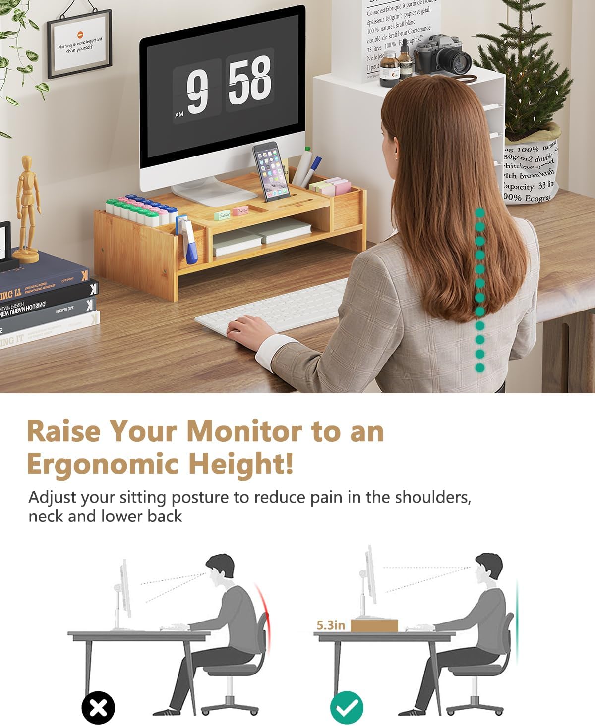 • ERGONOMIC MONITOR RISER: Spend all day at your desk? Proper monitor height is key to preventing cervical and lumbar strain. This monitor stand raises your screen to an ergonomic eye level, promoting better posture and reducing strain