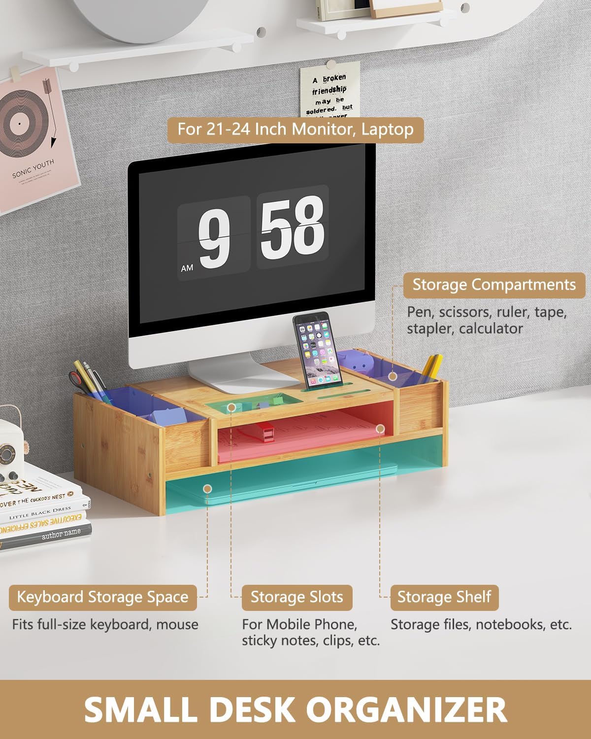 • SMALL SPACE ORGANIZER: Simply slide the keyboard underneath to save space, this monitor stand offers ample storage with side compartments for common office utensils (pen, highlighter,scissors, stapler), a middle shelf for files and notebooks, plus storage slots for your phone, sticky notes and clips