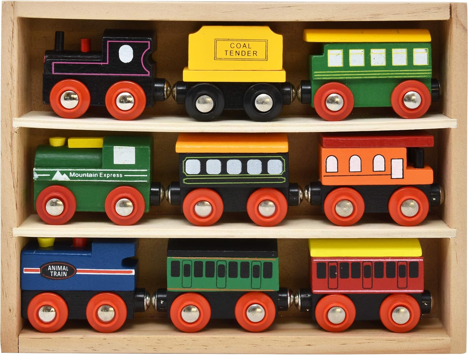 Get ready for some railway adventures! 9 wooden train cars, each about 3 inches long, link together with magnetic couplers in endless combinations for plenty of imaginative play. Brightly painted and beautifully crafted train cars. Steam Engine, Coal Tender, Animal Train, Mountain Express, Caboose and Coaches. Toy trains never go out of style. They are some of the best cognitive development toys on the market. This colorful wooden train set will help your child gain strong problem-solving and motor skills, while boosting their imagination and creativity. This amazing set contains 9 brightly painted train cars, all equipped with two strong magnets, one in the front and one in the back. Magnets allow your kids to easily attach train car combinations to create their own personalized railroad. Works with Thomas and all major brands of wooden train tracks. High quality wooden structure. Painted unique and suitable for children. Complies with all safety regulations. Strong magnetic attachment. Compatible with all other brand train systems. Your child's safety is our #1 priority. Tiny Conductor train cars are non-toxic and contain no lead, cadmium or phthalates. We invest in rigorous independent laboratory testing to ensure your children are 100% safe from harmful chemicals. Enjoy a safe and fun ride! Have a good trip!